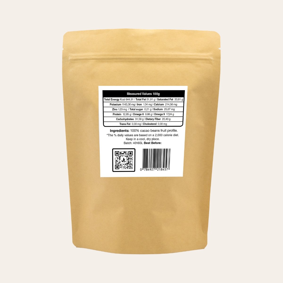 Conservar en un lugar fresco y seco, lejos de olores fuertes y de la luz solar directa. Asegúrate de que el envase esté bien sellado para preservar el delicado aroma frutal y las propiedades nutricionales del cacao crudo.