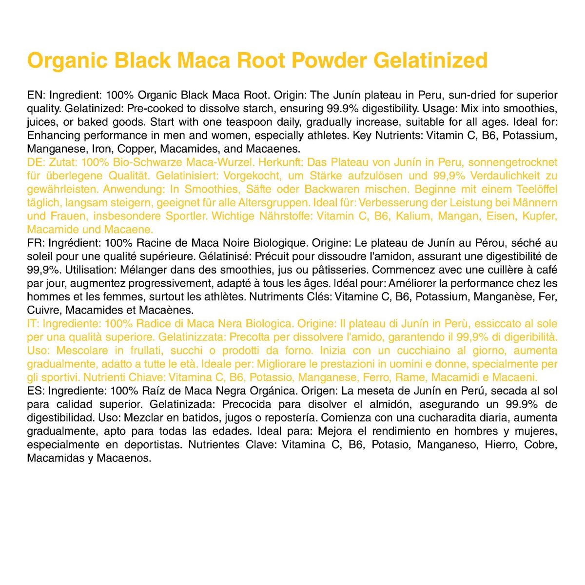 Descubre los potentes beneficios de la Raíz de Maca Negra Gelatinizada Orgánica de SelvaBio, perfecta para mejorar tu salud y rendimiento. Este superalimento único refuerza tus sistemas inmunitario y endocrino, aumenta la energía y la resistencia, y mejora la claridad mental. Reduce el estrés de forma natural, potencia la fertilidad y la libido, y es ideal para atletas y culturistas que buscan un rendimiento máximo. Un potente complemento para cualquier rutina de bienestar.